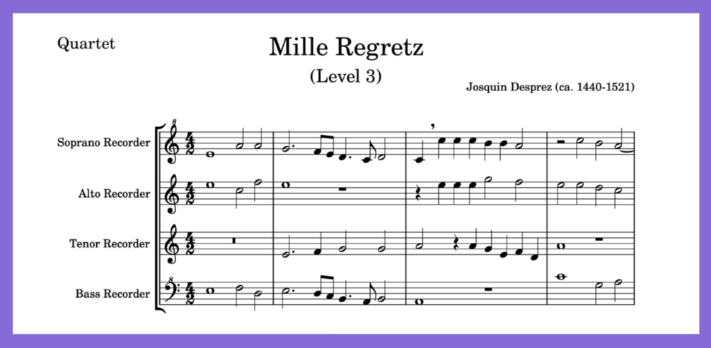 "Mille Regretz" by Josquin Desprez (ca.1440-1521), quartet for 4 recorders, Level 3